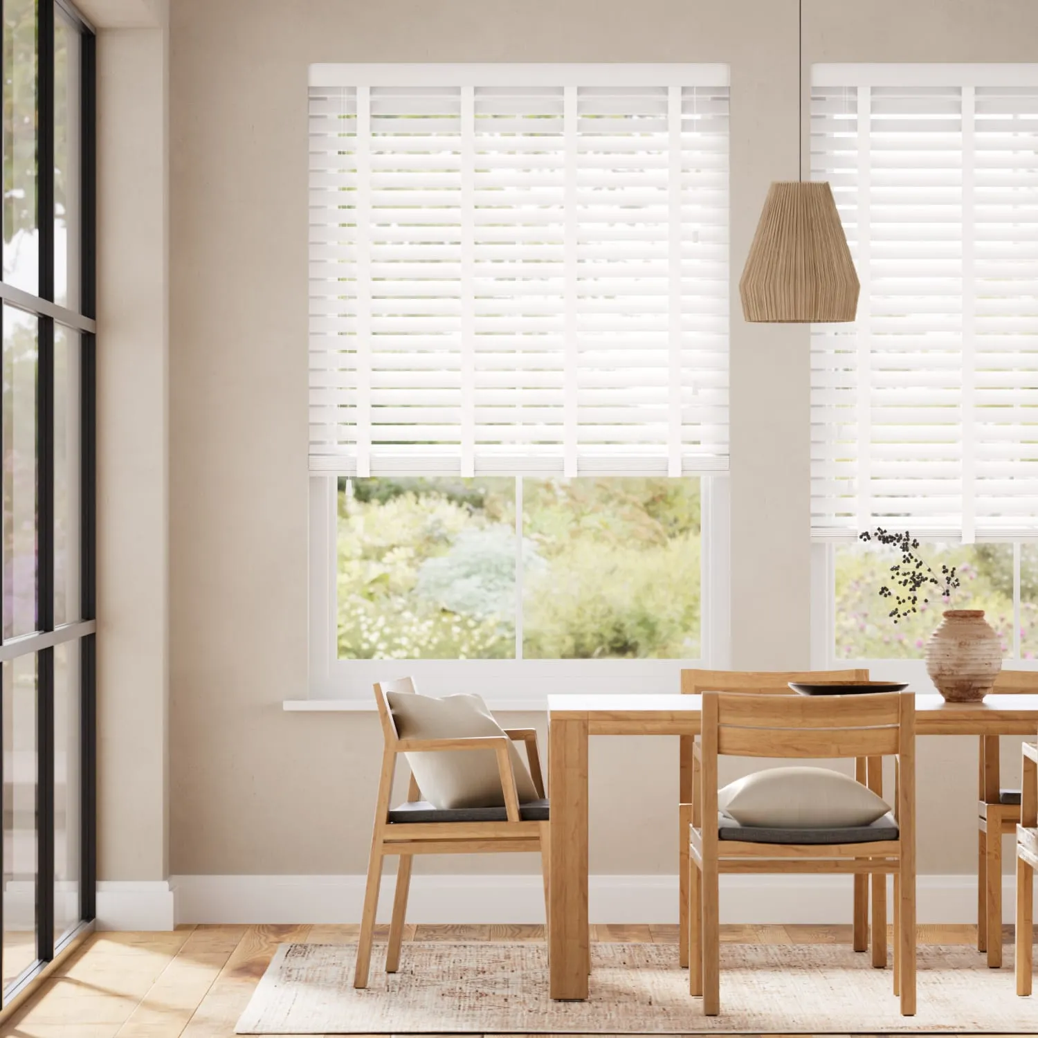 Create a bright, elegant finish in your home with this Icy White & Igloo faux wood blind—perfect for UAE interiors that value both modern style and long-lasting performance. The crisp white slats and slim decorative tapes deliver a clean, contemporary look that works beautifully across any colour palette. Made from durable, waterproof PVC, the blind stays flawless in humid kitchens and bathrooms while giving you smooth, precise control over privacy and daylight. Crafted to your exact measurements, it offers a polished, made-to-measure look ideal for fresh, stylish and practical living spaces.